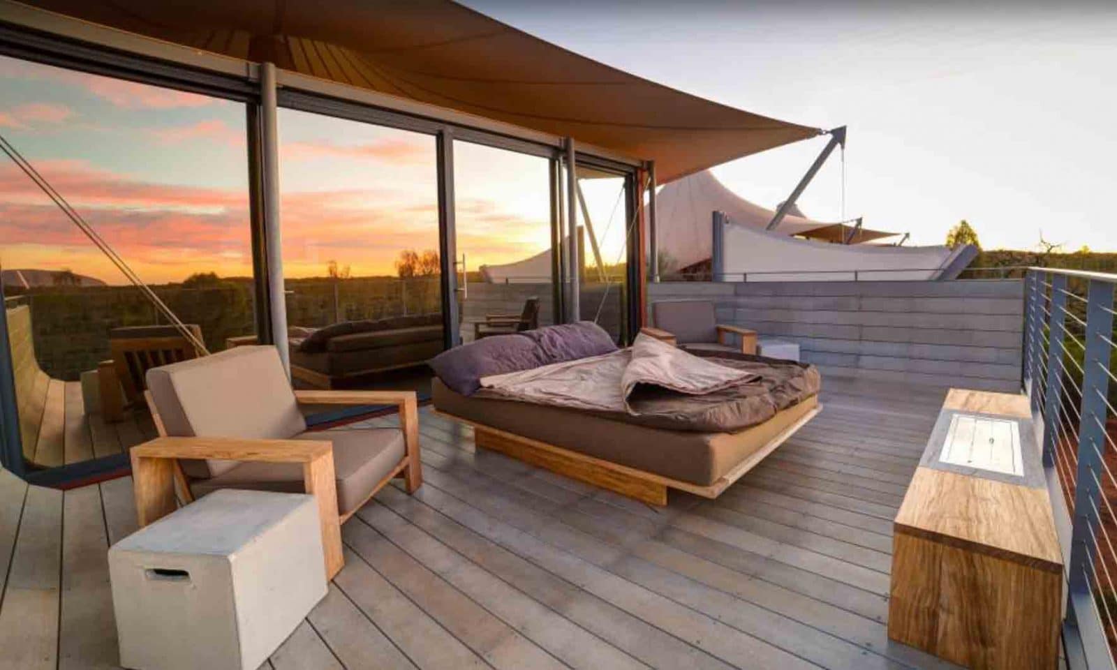 Le Longitude 131 est un éco-lodge de luxe construit par l’architecte australien Philip Cox. Ce campement unique est composé de 15 pavillons, tournés vers le site sacré du rocher Uluru. Luxueux, respectueux de l’environnement et romantique, le Longitude 131° propose une immersion dans la région reculée d’Uluru.L’établissement, spécialisé dans l’écotourisme, et récompensé, dispose d’un restaurant, The Dune House. Il offre une cuisine australienne moderne lors de dîners en commun conviviaux.Les tentes de luxes sont toutes dotées de l’air conditionné, d’un téléphone, d’un minibar, d’un coffre-fort et du nécessaire à thé et café.