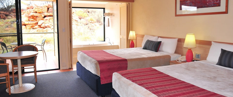 Le Kings Canyon Resort est facilement accessible par la route. Il se trouve à 7km du parc de Watarrka, à environ 4 heures de route d’Ayers Rock et à presque 4 h 30 de voiture d’Alice Springs.L’établissement dispose de deux piscine, d’une supérette, d’un court de tennis, d’une boutique de souvenirs et d’une station essence.Le Resort a été construit dans le respect total de la nature.Pour vos repas, vous pourrez profiter des installations pour barbecue dans la brousse ou déguster un dîner gastronomique dans le restaurant de l’hôtel.Vous pourrez choisir entre un hébergement de style routard dans la brousse ou des chambres privatives. Les chambres sont confortables et spacieuses et disposent de l’air conditionné, d’une TV avec films à la demande, d’un téléphone, d’un réfrigérateur et du nécessaire à thé et café.